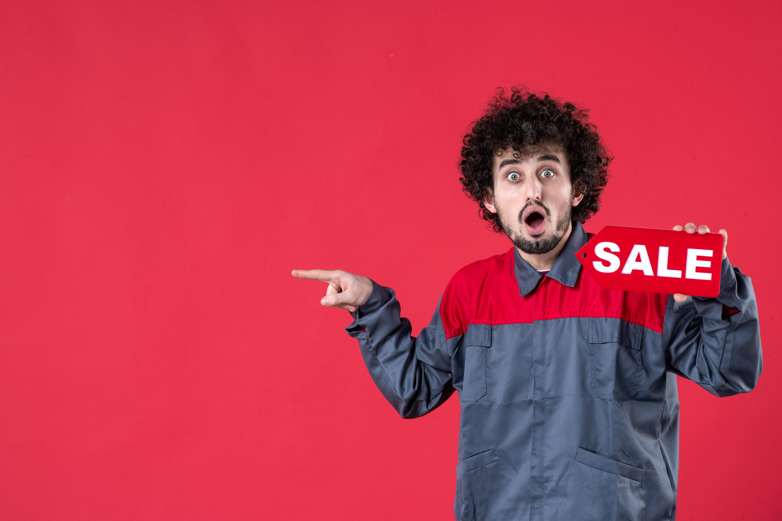 front-view-male-worker-holding-red-sale-nameplate-red-background-mechanic-photo-house-instrument-shopping-job-worker-uniform