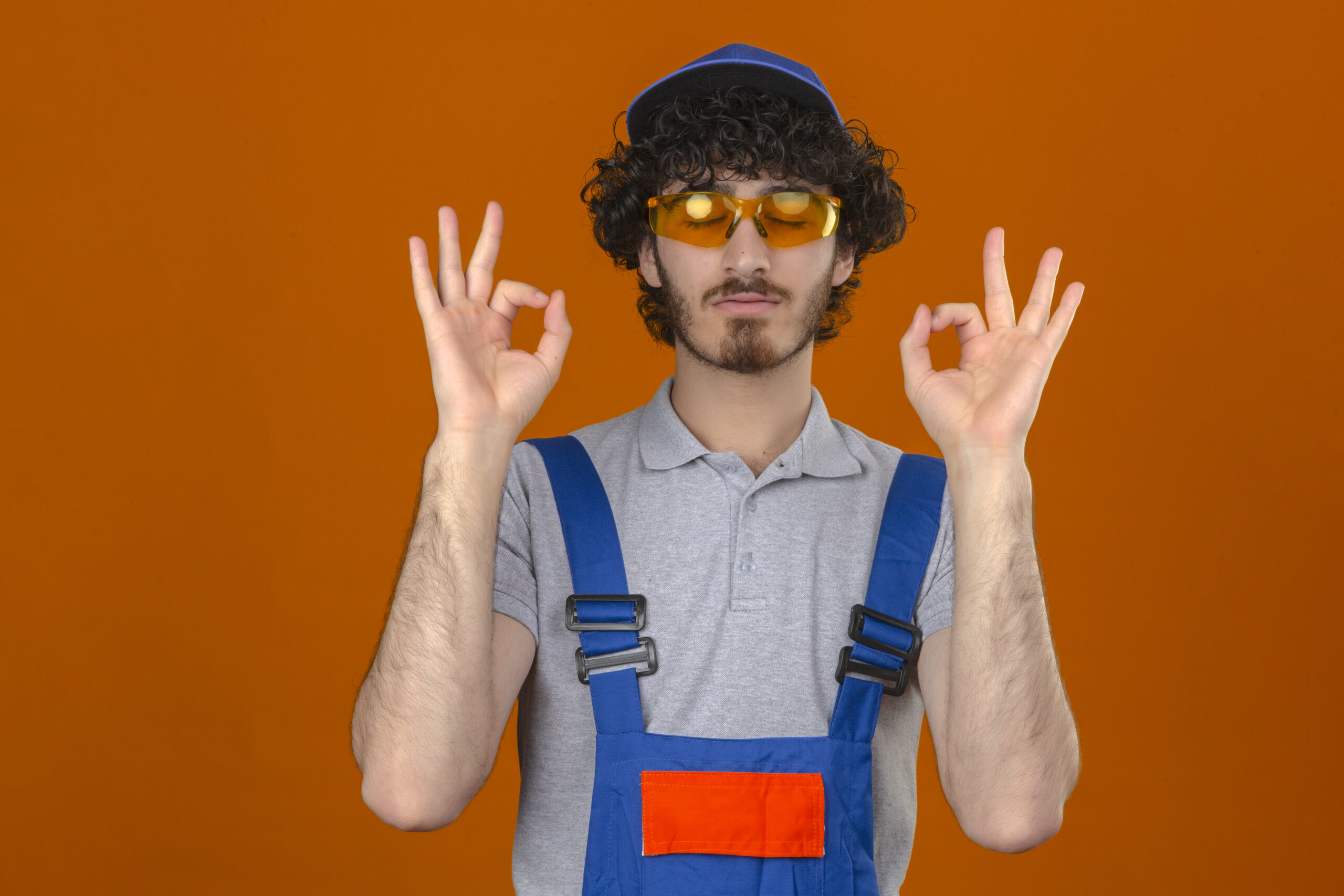 young breaded handsome builder worker wearing construction uniform glasses and cap relax and smiling with eyes closed doing meditation gesture with fingers over isolated orange background